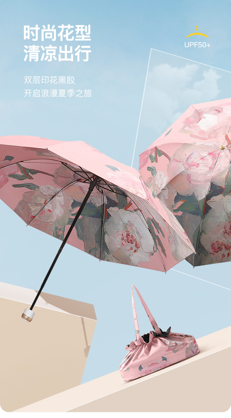 | 新款手提袋彩胶印花双层伞:伞布材质为黑胶布,过胶为彩胶,密度190T,伞骨材质为铁加纤维,中棒材质为铁,伞柄材质为abs,8骨设计,手动打开和收伞,款式为三折伞。有绿蔷薇,香雪兰,白玫瑰,粉芍药等彩胶花香满园系列,以及黄色、灰绿等流光花语系列可供选择。该伞具有防晒防紫外线功能,毛重370克,造型为双层伞。 |